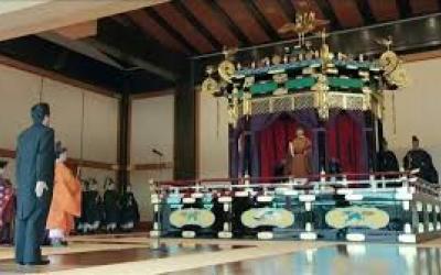 La ceremonia de entronización ha comenzado cuando, a modo de telón teatral, se han descorrido las cortinas colgadas de un dosel que escondían el Takamikura, el trono milenario desde donde Naruhito se autoproclamó emperador vestido con un traje ceremonial de varias capas, naranja oscuro la que estaba a la vista. A su lado, bajo un dosel más reducido y sentada en el trono más pequeño se encontraba la emperatriz Masako, vestida con un kimono de doce capas (que pesa unos 14 kg.). A su alrededor se encontraba, también con traje ceremonial, el resto de la familia imperial, menos los emperadores eméritos, Akihito y Michiko, ni tampoco la princesa Aiko, la única hija de los emperadores, aún menor de edad, y cuyo camino al trono está vetado por la ley sálica que impide que una mujer suba al trono del crisantemo.