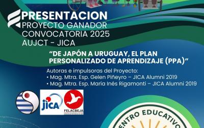 La Comisión Directiva y Fiscal de la Asociación Uruguayo Japonesa de Cooperación Técnica ( AUJCT), tiene el honor y el gusto de invitarles para el Evento que realizaremos de manera presencial y vía Zoom, el martes 24 de Marzo a la hora 07.45 PM, en que se realizará la Presentación del Proyecto Ganador de la Convocatoria 2025 de AUJCT - JICA: " De Japón a Uruguay, el Plan Personalizado de Aprendizaje ( PPA) ", presentado por las Ex Becarias: